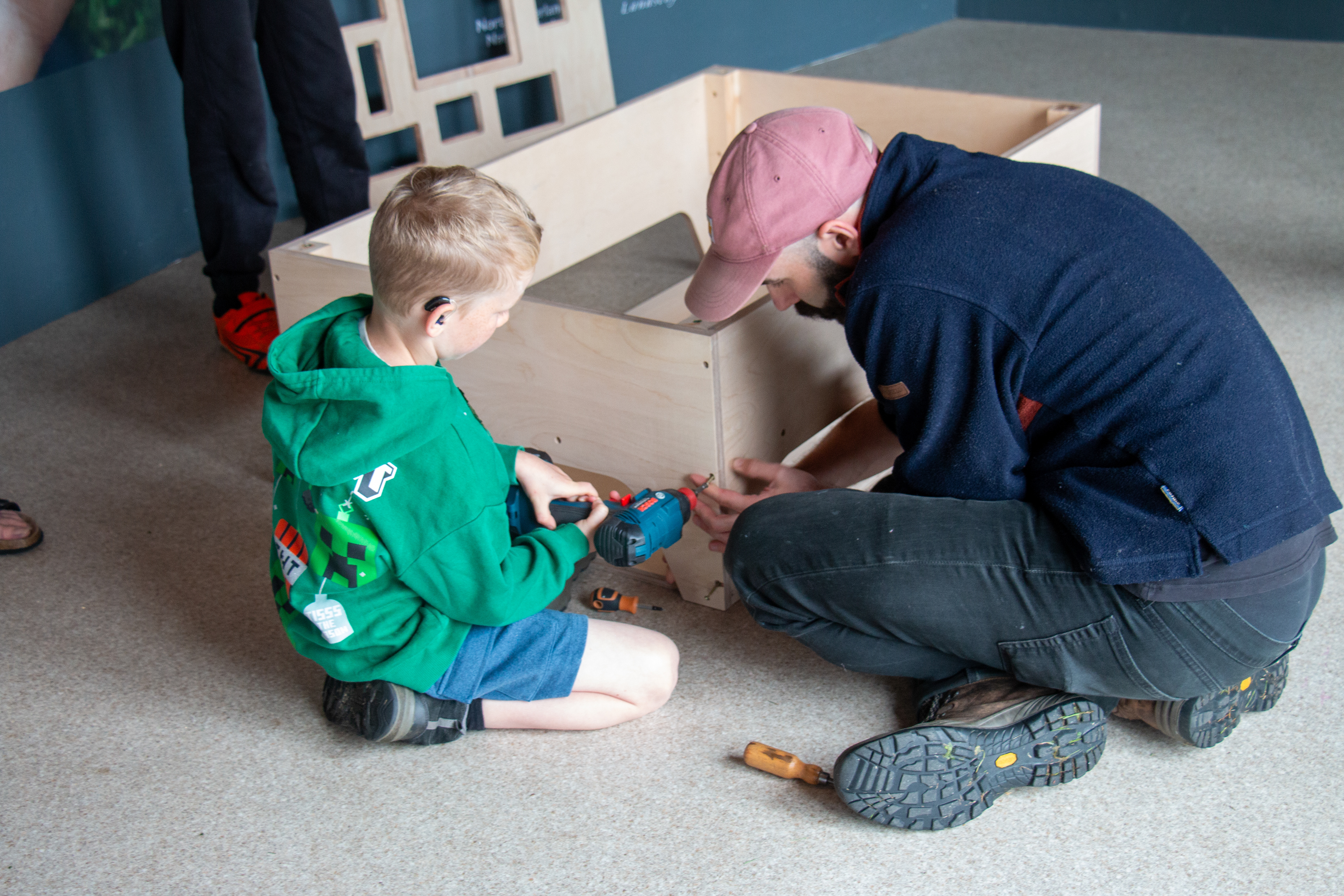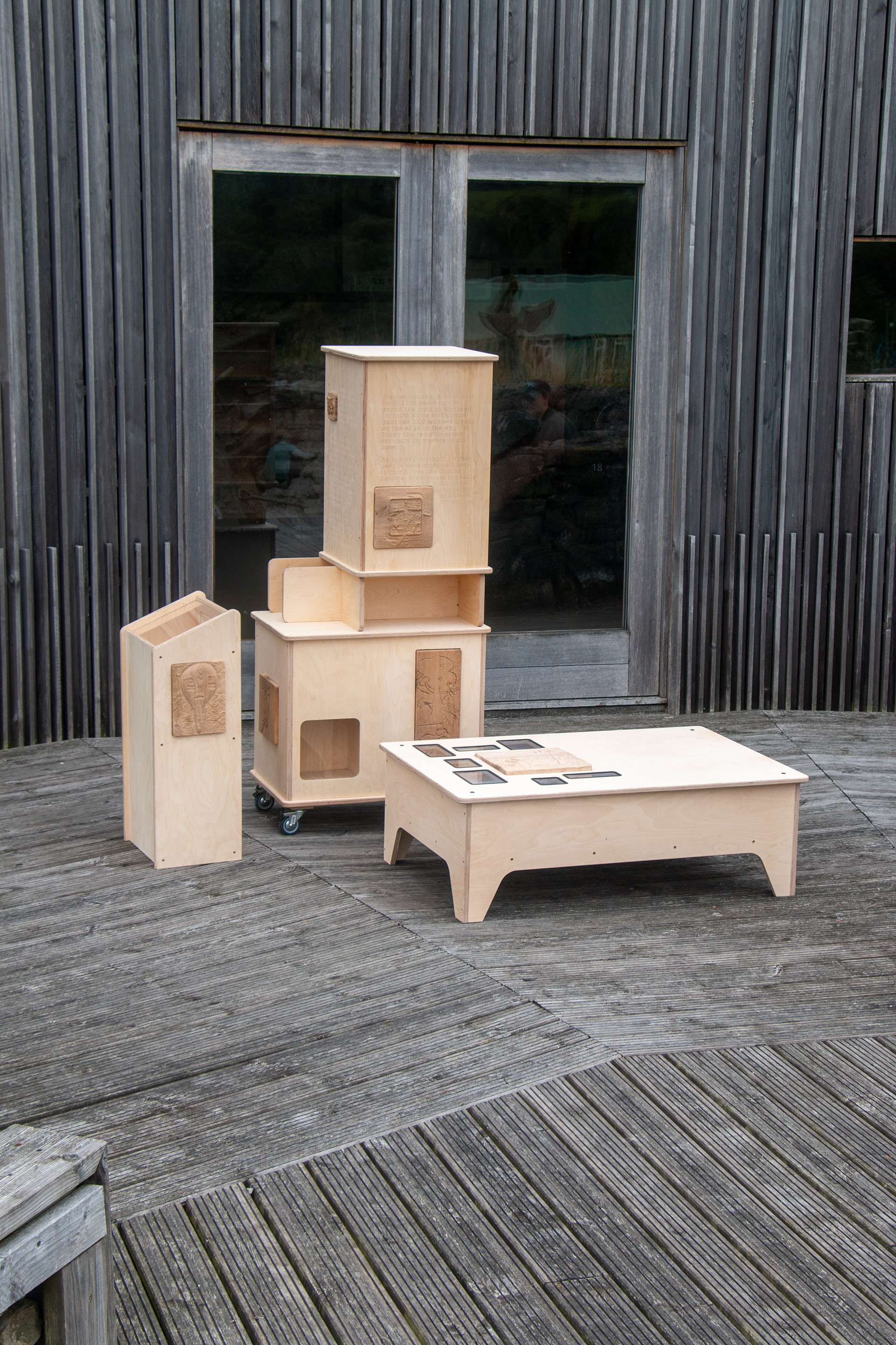 Brand-new furniture, designed and built by our young members, was pride of place. The three custom pieces reflect the kids’ initial cardboard concepts and were tied together by carved oak elements, showing imagery from participants’ (young and old) memories of the project. These pieces have been gifted to Redesdale for permanent use in the little museum.